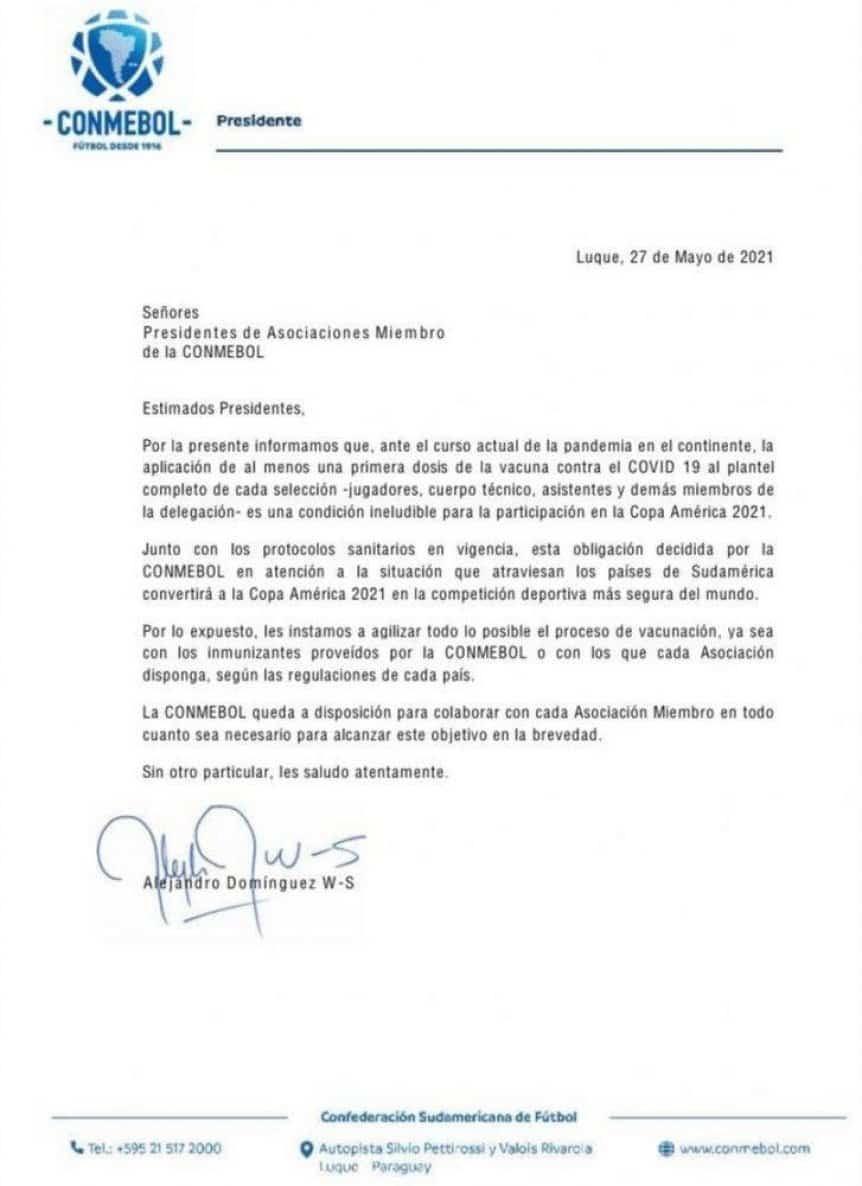 «Junto con los protocolos sanitarios en vigencia, esta obligación decidida por Conmebol en atención a la situación que atraviesan los países de Sudamérica convertirá a la Copa América 2021 en la competición deportiva más segura del mundo», añadieron.