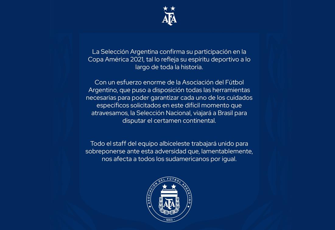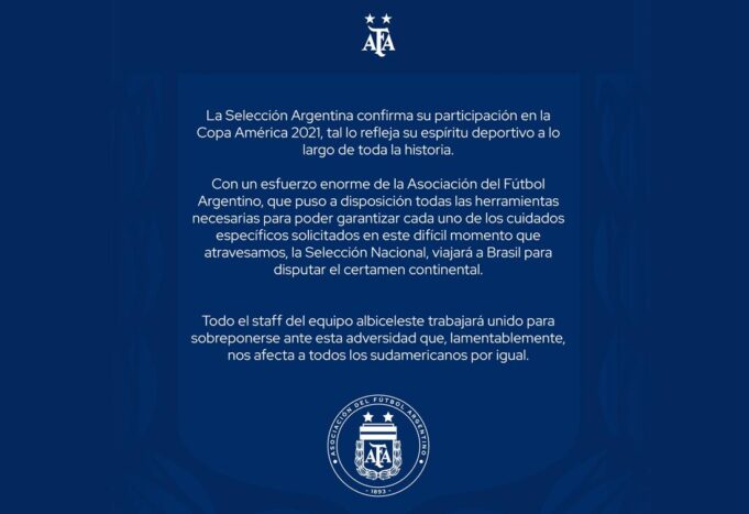 Mientras avanza la segunda ola de coronavirus por la Argentina y por toda Sudamérica y Brasil, la AFA informó que la Selección Nacional disputara el torneo continental tal como estaba estipulado. «Con un esfuerzo enorme de la Asociación del Fútbol Argentino, que puso a su disposición todas las herramientas necesarias para poder garantizar cada uno de los cuidados específicos en este difícil momento que atravesamos», reza parte del anuncio.