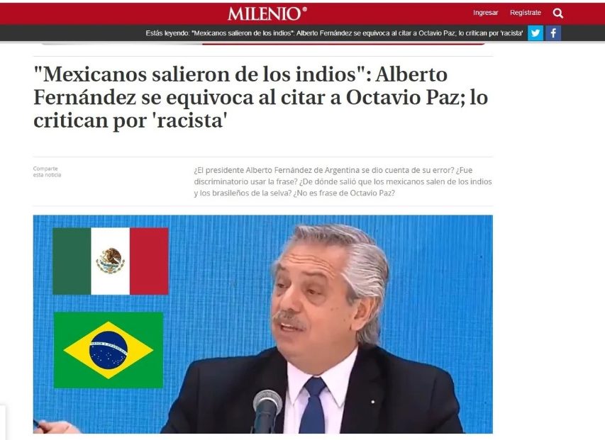 «¿El presidente Alberto Fernández se dio cuenta de su error? ¿Fue discriminatorio usar esa frase? ¿De dónde salió que los mexicanos salen de los indios y los brasileños de la selva? ¿No es frase de Octavio Paz?», planteó el periódico como dudas ante la polémica.