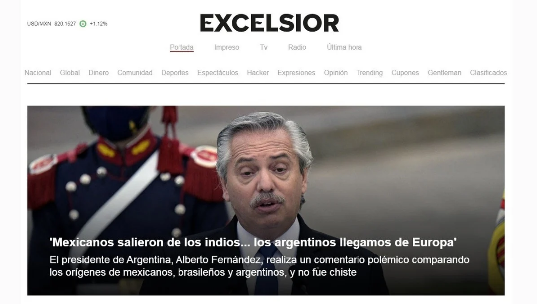 Por su parte el diario Excelsior de México destacó la noticia como la principal de la jornada: «Los mexicanos salieron de los indios… los argentinos llegamos de Europa», tituló ese sitio y describió: «El presidente de Argentina, Alberto Fernández, realiza un comentario polémico comparando los orígenes de mexicanos, brasileños y argentinos, y no fue chiste».