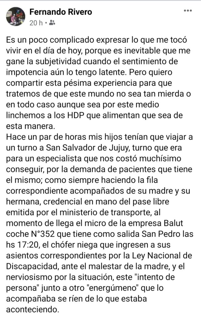 Gran malestar e indignación en una familia de San Pedro de Jujuy, luego de que un chofer de la empresa Balut Hnos. que debía trasladar a dos pequeños hermanos desde nuestra ciudad hasta San Salvador de Jujuy para asistir al turno con un especialista, les negara el acceso al micro, a pesar de que ambos cuentan con certificado de discapacidad y que por ley, con la sola presentación del mismo, se debe garantizar el uso del trasporte público gratuito. Además, hubo risas y burlas de parte del conductor y una persona que lo acompañaba en ese momento.