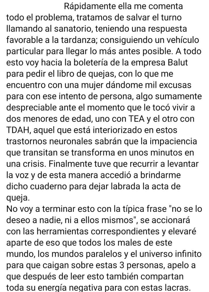 Pero el destrato por parte de los trabajadores de la firma antes mencionada no terminaría allí. Al dirigirse el padre de los menores a la boletería correspondiente, solicitando el libro de quejas para dejar asentada la situación que acababan de sufrir, este le fue negado por la encargada. Finalmente y luego de una acalorada discusión, se pudo labrar el acta de quejas.