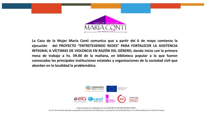 El próximo jueves 6 de mayo se inicia la ejecución de la primera actividad planificada en el Proyecto «Entretejiendo Redes» para fortalecer la asistencia integral a víctimas de violencia en razón del género. El mismo se ejecuta en el marco del Proyecto Cerrando Brechas II: «Desnaturalizando violencias ocultas para erradicar la violencia de género promoviendo la igualdad» coordinado por ELA.