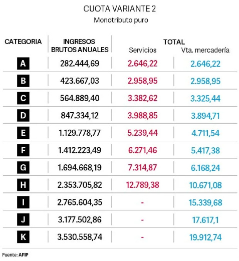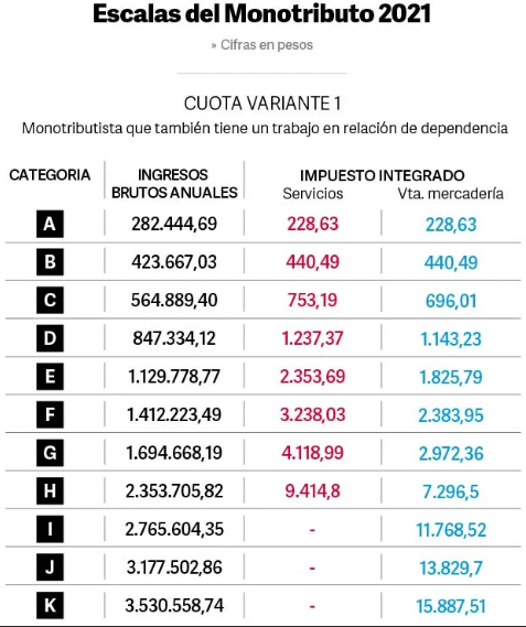 Esa deuda generada, cada contribuyente podrá saldarla hasta en 20 cuotas. Los nuevos valores de las categorías del monotributo fueron actualizados de acuerdo a la variación del haber mínimo garantizado y es de 35,3%.