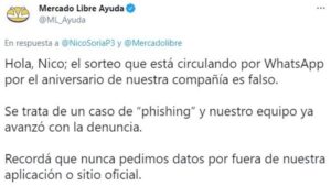 Ante las consultas de varios usuarios, la cuenta de Ayuda de Mercado Libre tuiteó: «El sorteo que está circulando por WhatsApp por el aniversario de nuestra compañía es falso. Se trata de un caso de ‘phishing’ y nuestro equipo ya avanzó con la denuncia. Recordá que nunca pedimos datos por fuera de nuestra aplicación o sitio oficial».