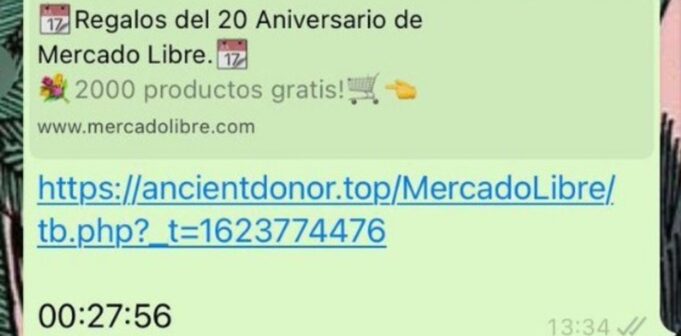 El mensaje, que promociona «unos 2000 productos gratis» por el 20 aniversario de la empresa de Marcos Galperin, como por ejemplo un celular Huawei, incluye un link que al abrirse se reenvía automáticamente al resto de los contactos. Además, quedan expuestos los datos e información del usuario de cualquier celular, lo que buscan los ciberdelincuentes.