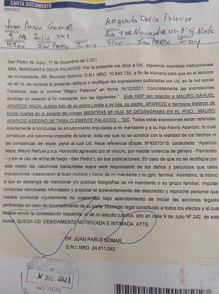 APARTE DE QUE TU HIJO MAURO NAHUEL APARICIO MAZA NOS HIZO TANTO DAÑO, TENES EL TUPE DE MANDAR A MI MAMÁ UNA CARTA DOCUMENTO.¿?