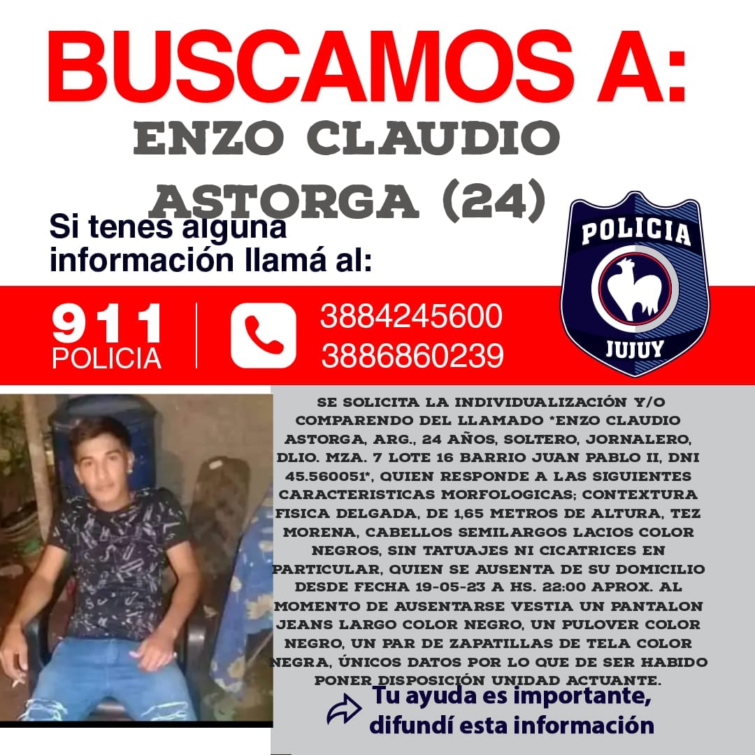 Se solicita a quienes pueden aportar información sobre el caso, comunicarse con el 911 o los números 388-4245600 y 388-6860239.