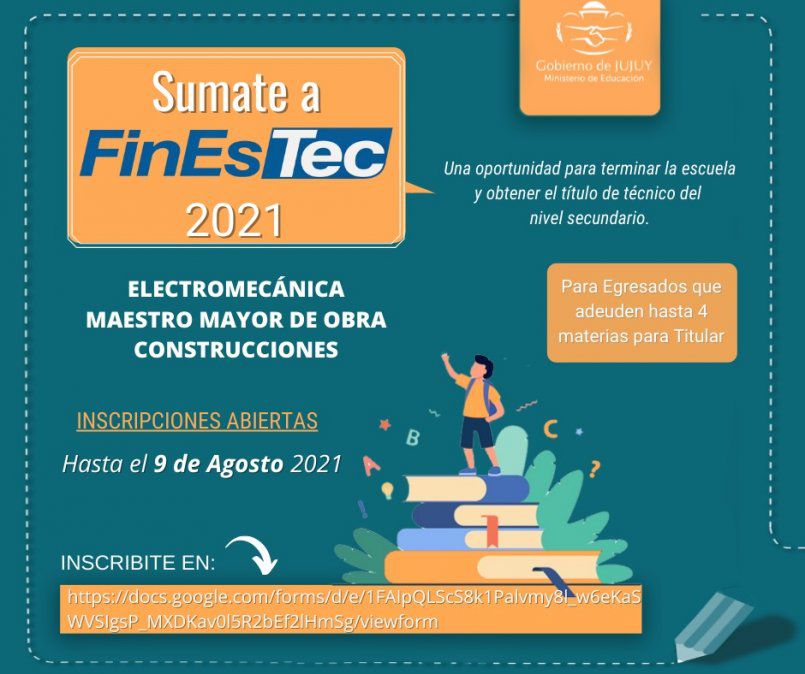 El Ministerio de Educación de la Provincia de Jujuy, a través de la Dirección de Educación Técnico Profesional, informa a los interesados en finalizar sus estudios secundarios técnicos, que se inicia la inscripción para el Plan de Finalización de Estudios Técnicos de Nivel Secundario-FinEsTec, periodo 2021.